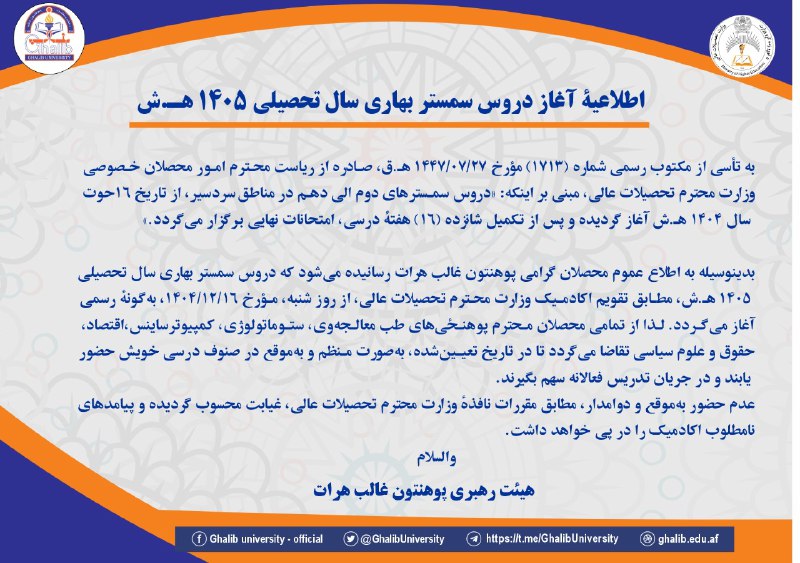 اطلاعیهٔ آغاز دروس سمستر بهاری سال تحصیلی ۱۴۰۵ هـ.ش